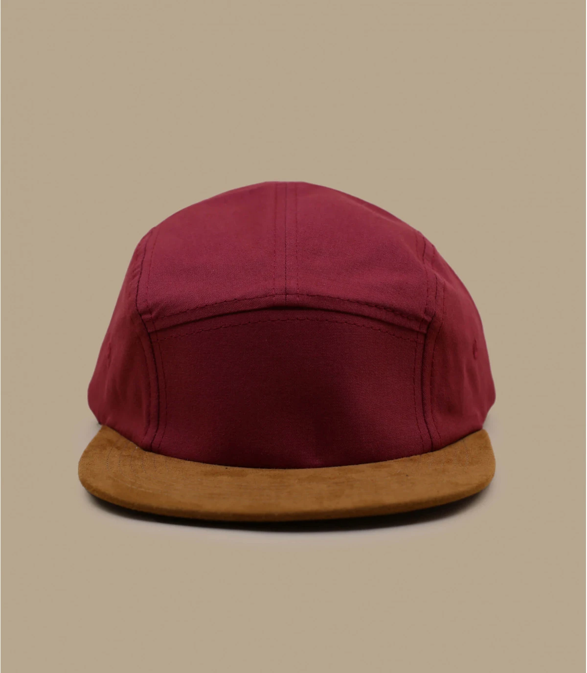 5 Panel bordeaux en coton washed avec visiĂšre suede marron. Attache rĂ©glable avec clip Ă l’arriĂšre. Tour de tĂȘte 55-60 cm.