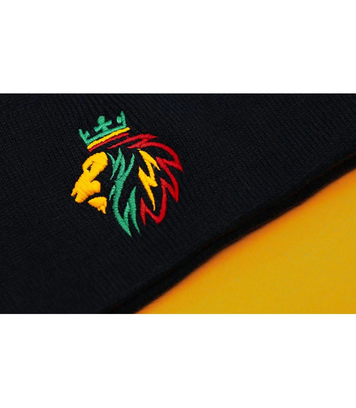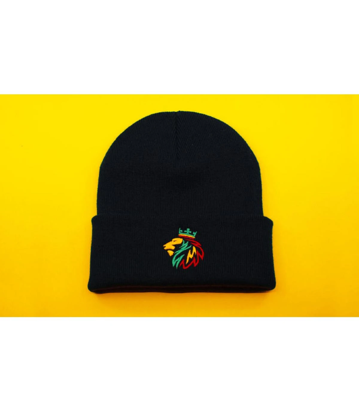 Bonnet noir, brodĂ© sur le revers dâun superbe Lion de Judas couronnĂ©, dans les couleurs du mouvement rastafari. La forme standard de ce modĂšle discret emboite bien la tĂȘte.
