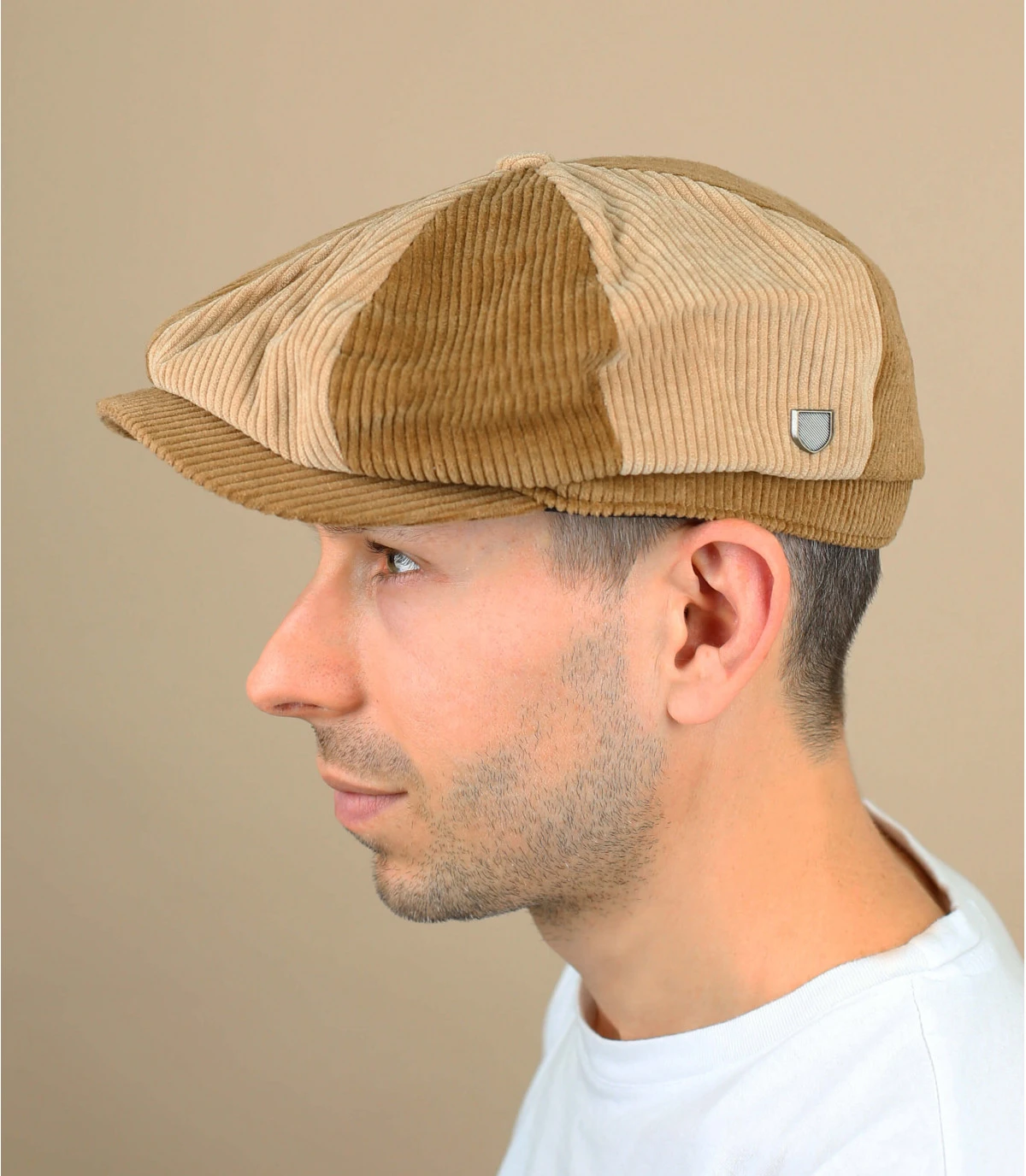 Ce béret gavroche est original avec ses deux tons de beige et sa forme extra bouffante. Il est décoré d’une épingle métallique sur le côté qui représente le logo de Brixton.